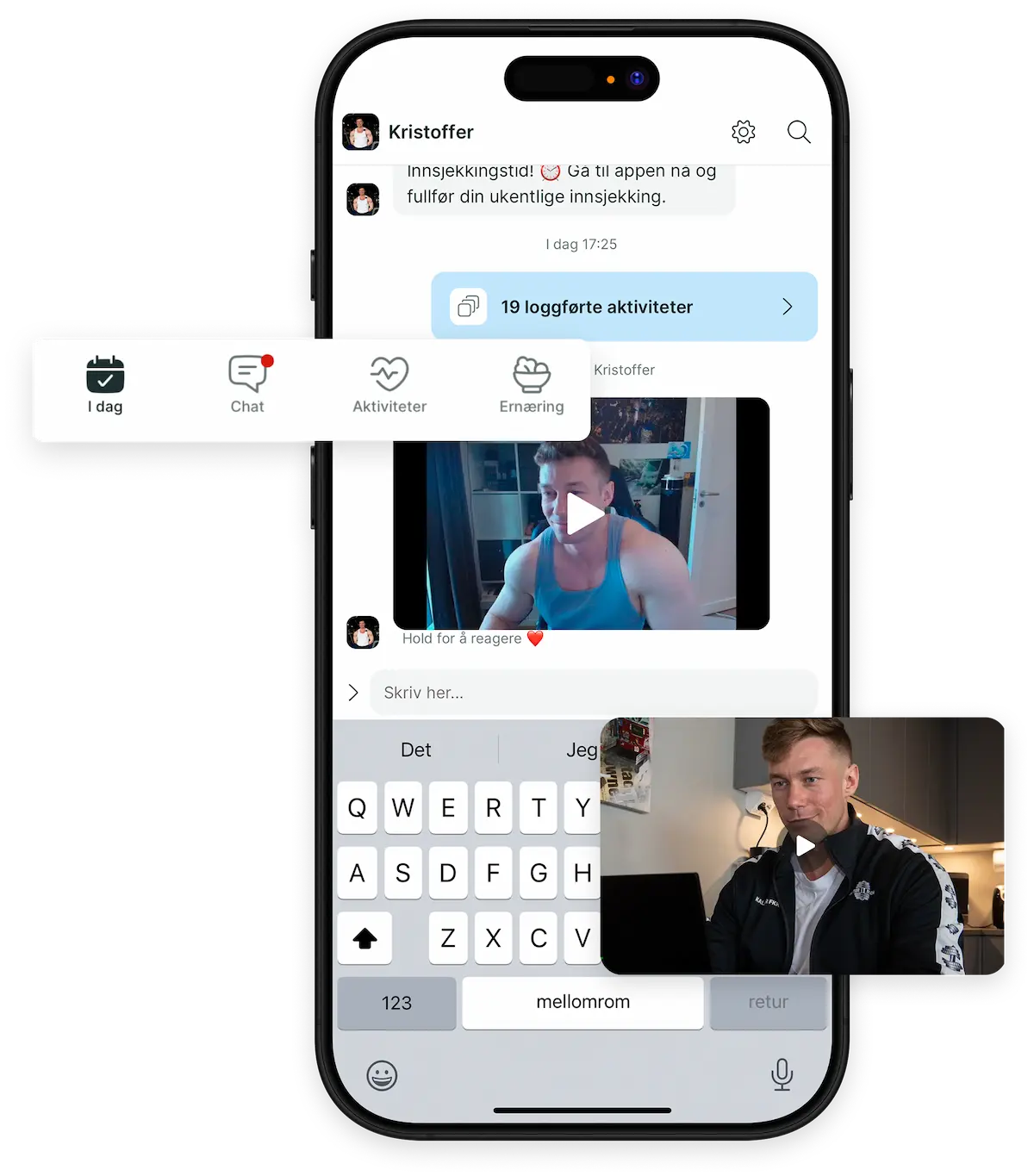 Vi kommuniserer direkte i chatten i appen. Du kan sende meldinger når du vil, og jeg gir deg personlige svar – ofte som videomeldinger og jeg prøver å lære deg så mye som mulig så du klarer deg på egenhånd etter coachingen.